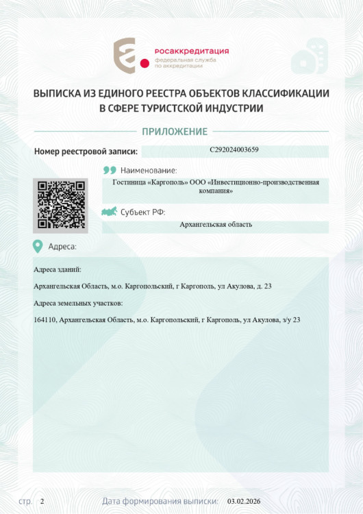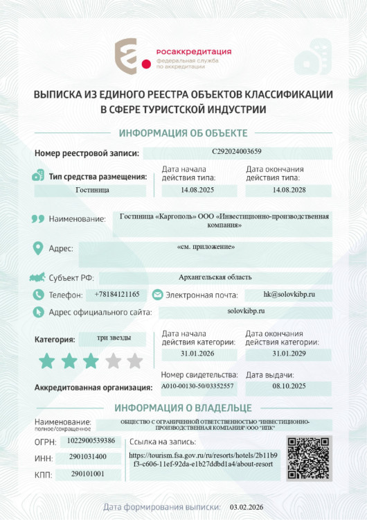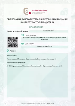 Комфортабельная гостиница «Каргополь» расположена в самом центре старинного русского города Каргополь, который по праву считают душой Русского Севера. Это единственная гостиница в городе Каргополь которая имеет аккредитацию "Три звезды".